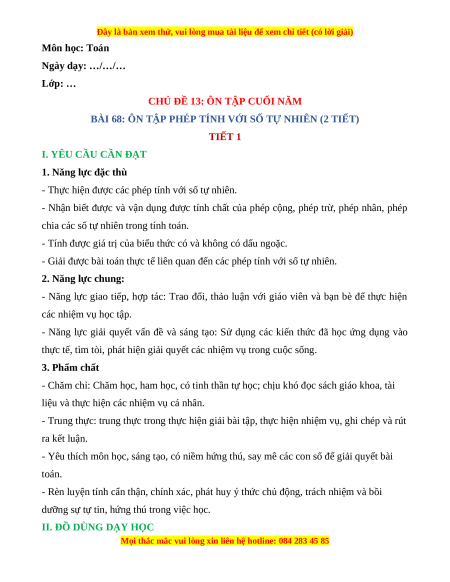 BÀI 68: ÔN TẬP PHÉP TÍNH VỚI SỐ TỰ NHIÊN (2 TIẾT) TIẾT 1