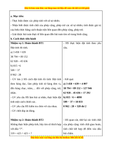 - HS thực hiện đặt tính theo yêu Đặt tính rồi tính. cầu. a) 3 458 + 639 38 794 + 89 152 62 928 – 45 636 b) 815 ×6 509 × 37 8 962 : 28