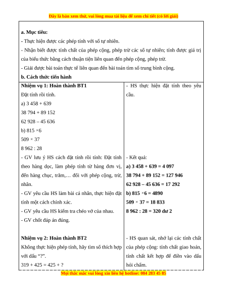 - Nhận biết được tính chất của phép cộng, phép trừ các số tự nhiên; tính được giá trị