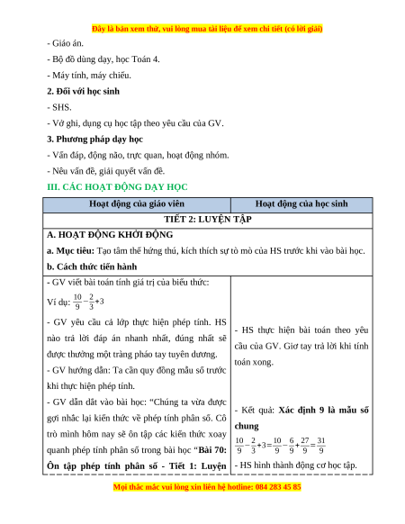 BÀI 70: ÔN TẬP PHÉP TÍNH VỚI PHÂN SỐ (2 tiết) TIẾT 1