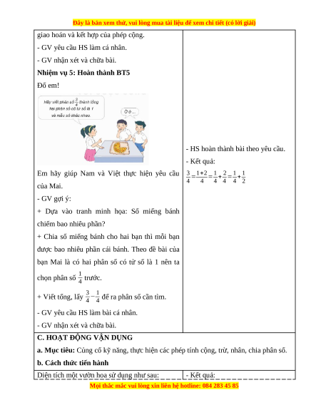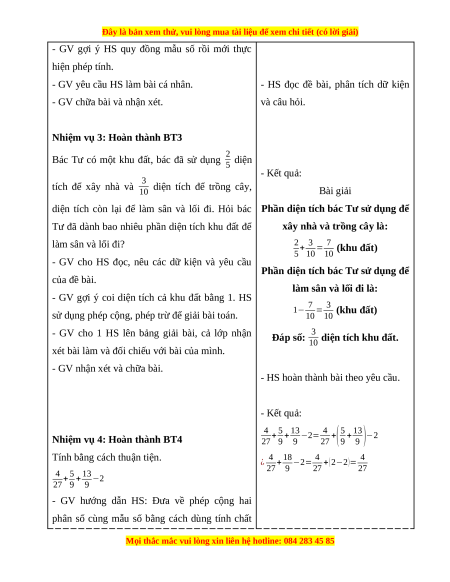 - Giải được bài toán thực tế liên quan đến phép cộng, phép trừ phân số.
