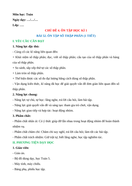 - Vận dụng kiến thức, kĩ năng đã học để giải quyết vấn đề đơn giản liên quan đến số thập phân. 2. Năng lực chung: