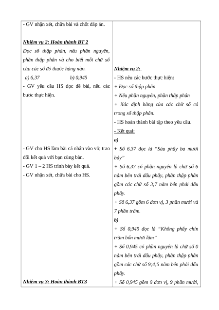 của các số đó thuộc hàng nào. Nhiệm vụ 2: a) 6,37 b) 0,945