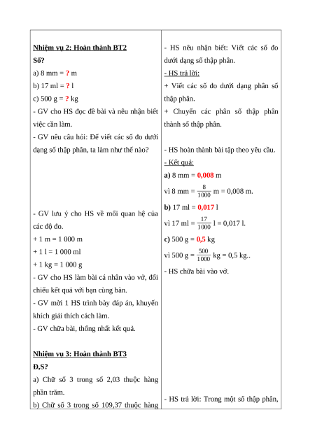 - HS thực hiện được đổi đơn vị đo dưới dạng số thập phân.