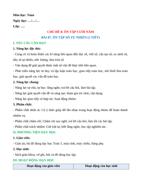 Giáo án Ôn tập số tự nhiên Toán lớp 5 Chân trời sáng tạo