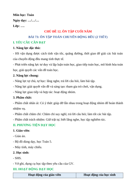 BÀI 73: ÔN TẬP TOÁN CHUYỂN ĐỘNG ĐỀU (2 TIẾT)