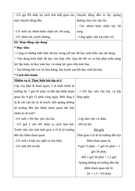 - HS vận dụng được cách tính vận tốc, quãng đường, thời gian để giải các bài toán