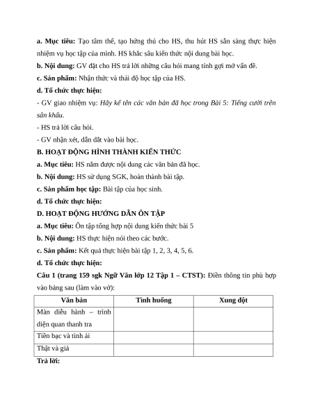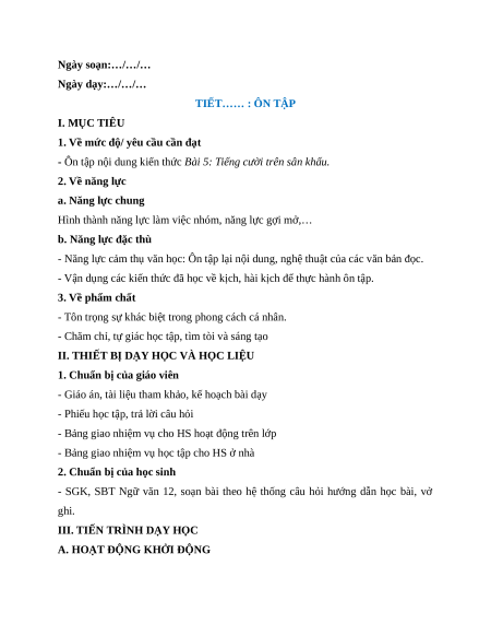 - Ôn tập nội dung kiến thức Bài 5: Tiếng cười trên sân khấu. 2. Về năng lực a. Năng lực chung