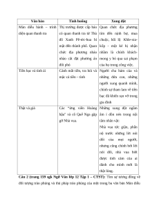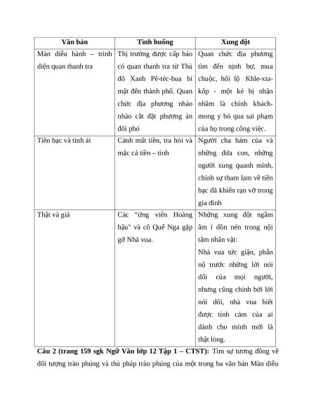 vào bảng sau (làm vào vở): Văn bản Tình huống Xung đột Màn diễu hành – trình diện quan thanh tra Tiền bạc và tình ái Thật và giả Trả lời: Văn bản Tình huống Xung đột