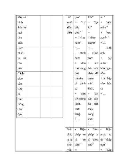 ngữ + “cá + “ấp + “nốt ảnh, từ tiêu đầy iu” trầm” ngữ biểu ghe” + + “xao tiêu + “vị xa “nồng xuyến” biểu xăm” đượm” + … Biện + … + … - Hình pháp - Hình - Hình ảnh: tu từ ảnh: ảnh: + đất chủ + dân + lên nước yếu