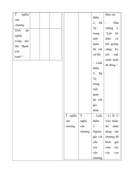 - Luận đò đông.” điểm 3: Bà Tú trong mối quan hệ với gia đình Ý nghĩa Ý - Luận - Lí lẽ 2: văn nghĩa điểm Văn nhân, chương văn 1: thi nhân chương Nguồn dùng văn gốc cốt chương để yếu khơi gợi của cảm xúc văn của con chương là lòng người thương - Dẫn người, chứng 2: thương Tình cảm, muôn cảm giác loài, của người muôn thời bây vật. giờ đều do - Luận người xưa điểm sáng tạo, 2: Ý lấy cảm nghĩa hứng từ của thế giới văn khách chương quan và là khơi lưu truyền gợi lại. cảm xúc của một con người