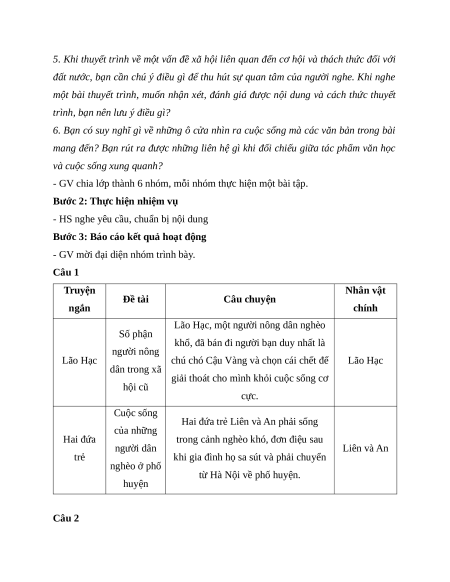 1. Lập bảng để tóm tắt, hệ thống những vấn đề như đề tài, câu chuyện, nhân vật