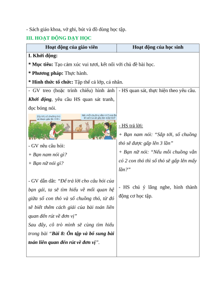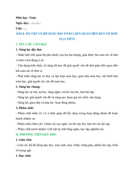 BÀI 8. ÔN TẬP VÀ BỔ SUNG BÀI TOÁN LIÊN QUAN ĐẾN RÚT VỀ ĐƠN VỊ (2 TIẾT)