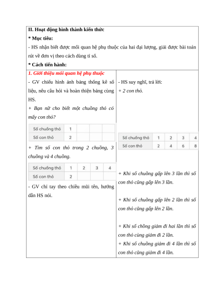 - Nhận biết mối quan hệ phụ thuộc của hai đại lượng, giải được bài toán rút về đơn