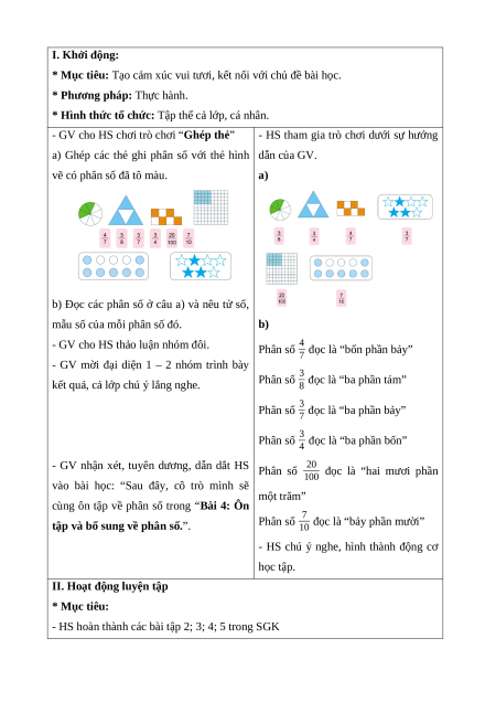 - Ôn tập và củng cố về phân số: Khái niệm ban đầu về phân số, tử số, mẫu số; đọc,