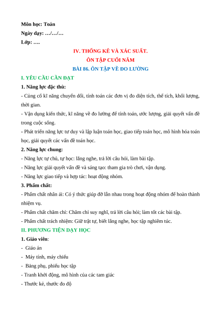 Giáo án Ôn tập về đo lường Toán lớp 5 Cánh diều