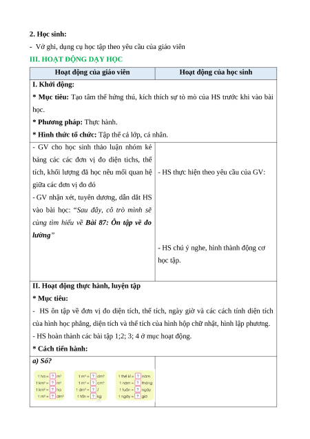 - HS ôn tập về đơn vị đo diện tích, thể tích, ngày giờ và các cách tính diện tích