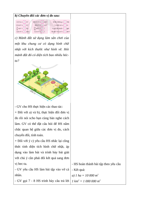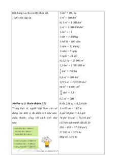 trên bảng và cho cả lớp nhận xét. 1 km2 = 100 ha - GV chốt đáp án. 1 m2 = 100 dm2 b) 1 m3 = 1 000 dm3 1 m3 = 1 000 000 dm3 1 dm3 = 1 l 1 tấn = 1 000 kg 1 thế kỉ = 100 năm 1 năm = 12 tháng 1 tuần = 7 ngày 1 ngày = 24 giờ b) 2,5 ha = 25 000 m2 1,3 km2 = 1 300 000 m2 3 km2 = 750 ha 4 0,8 m2 = 800 dm2 123,5 m3 = 123 500 dm3 68 m2 = 6 800 cm2 13 dm3 = 1,3 l 10 0,5 m3 = 500 l