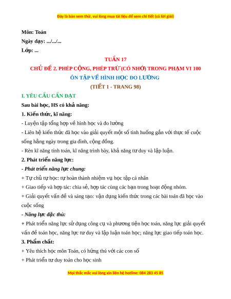 I. YÊU CẦU CẦN ĐẠT Sau bài h c, H ọ S có kh năng: ả 1. Ki n t ế h c, kĩ ứ năng: - Luyện t p ậ tổng h p v ợ ề hình h c và đo l ọ ư ng ờ - Liên h ki ệ n t ế h c ứ đã h c vào gi ọ i ả quy t ế m t ộ s t ố ình hu ng g ố n v ắ i ớ th c t ự ế cu c ộ sống h ng