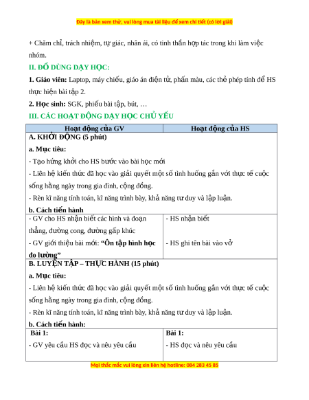 - Rèn kĩ năng tính toán, kĩ năng trình bày, kh năng t ả duy và l ư p l ậ u n. ậ b. Cách ti n h ế ành - GV cho HS nh n bi ậ t ế các hình và đo n ạ - HS nh n bi ậ t ế th ng, ẳ đư ng cong, đ ờ ư ng ờ g p khúc ấ - GV gi i ớ thi u bài ệ m i ớ : “Ôn t p hì ậ nh h c ọ - HS ghi tên bài vào vở đo lư ng” ờ B. LUY N Ệ T P Ậ – TH C Ự HÀNH (15 phút) a. Mục tiêu: - Liên h ki ệ n t ế h c ứ đã h c vào gi ọ i ả quy t ế m t ộ s t ố ình hu ng g ố n v ắ i ớ th c t ự ế cu c ộ sống h ng