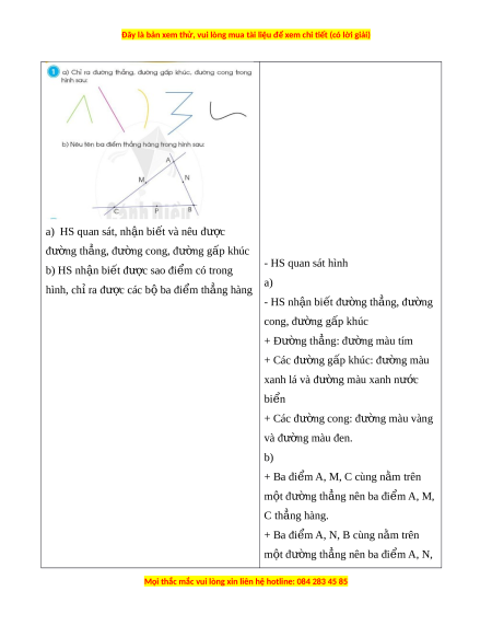 a) HS quan sát, nh n bi ậ t ế và nêu đư c ợ đư ng ờ th ng, đ ẳ ư ng ờ cong, đư ng g ờ p khúc ấ - HS quan sát hình b) HS nh n bi ậ t ế đư c ợ sao đi m ể có trong a) hình, chỉ ra đư c các ợ b ba đi ộ m ể th ng ẳ hàng - HS nh n bi ậ t ế đư ng ờ th ng, đ ẳ ư ng ờ cong, đư ng ờ gấp khúc + Đư ng ờ th ng: ẳ đư ng m ờ àu tím + Các đư ng g ờ p khúc: ấ đư ng ờ màu xanh lá và đư ng m ờ àu xanh nư c ớ bi n ể + Các đư ng cong: ờ đư ng ờ màu vàng và đư ng ờ màu đen. b) + Ba đi m ể A, M, C cùng n m ằ trên m t ộ đư ng ờ th ng nên ba ẳ đi m ể A, M, C th ng hàng. ẳ + Ba đi m ể A, N, B cùng n m ằ trên m t ộ đư ng ờ th ng nên ba ẳ đi m ể A, N,