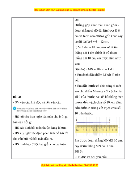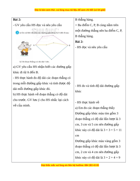 Bài 2: B th ng hàng. ẳ - GV yêu c u H ầ S đ c và nêu yêu c ọ u ầ + Ba đi m ể C, P, B cùng n m ằ trên m t ộ đư ng ờ th ng nên ba ẳ đi m ể C, P, B th ng hàng. ẳ Bài 2: - HS đ c và nêu ọ yêu c u ầ a) GV yêu cầu HS nh n bi ậ t ế các đư ng g ờ p ấ khúc đi t ừ A đ n B ế . - HS th c hành đo đ ự dài ộ các đo n ạ th ng ẳ có trong mỗi đư ng ờ g p khúc ấ và tính đư c đ ợ ộ - HS đo và tính đ dài ộ đư ng ờ g p ấ dài mỗi đư ng g ờ p khúc đó. ấ khúc b) HS th c hành v ự đo ẽ n ạ th ng ẳ có đ dài ộ cho trư c. ớ GV l u ý cho H ư S nh c l ắ i ạ cách - HS th c hành v ự ẽ vẽ c a ủ mình. a) Em đo các đo n t ạ h ng ẳ th y ấ Đư ng ờ g p khúc m ấ àu tím g m ồ 3 đo n ạ th ng có đ ẳ ộ dài l n l ầ ư t ợ là 3