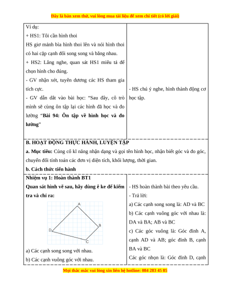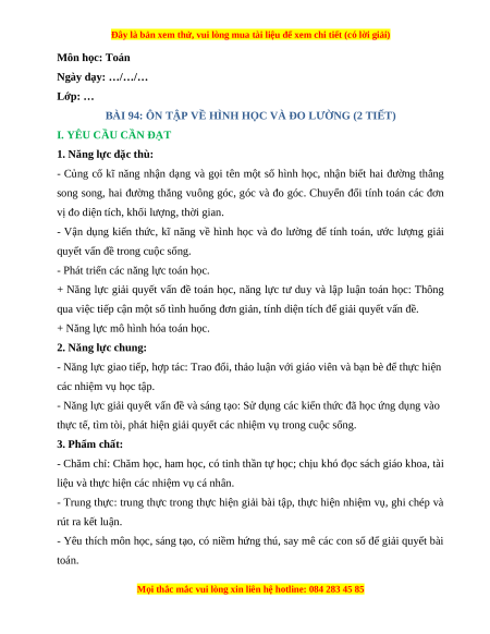 BÀI 94: ÔN TẬP VỀ HÌNH HỌC VÀ ĐO LƯỜNG (2 TIẾT)