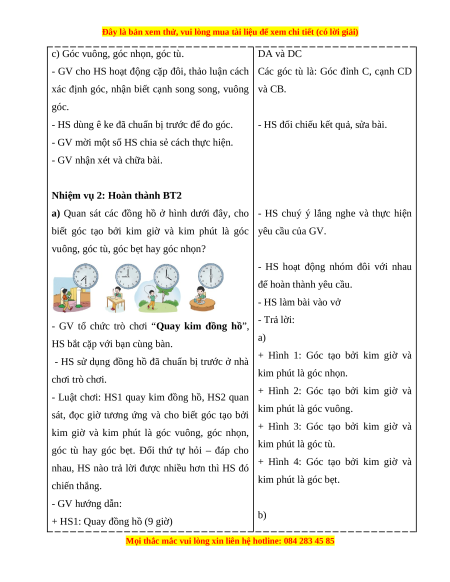 - HS sử dụng đồng hồ đã chuẩn bị trước ở nhà kim phút là góc nhọn. chơi trò chơi.