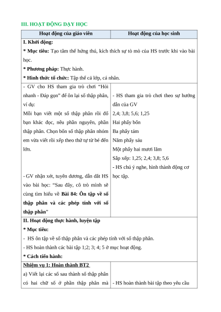 III. HOẠT ĐỘNG DẠY HỌC