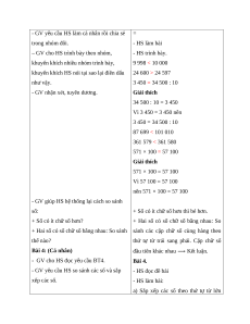 - GV nhận xét, tuyên dương. Giải thích 34 500 : 10 = 3 450 Vì 3 450 = 3 450 nên 3 450 = 34 500 : 10 87 699 < 101 010 361 579 < 361 580 571 × 100 = 57 100 Giải thích 571 × 100 = 57 100 Vì 57 100 = 57 100 nên 571 × 100 = 57 100