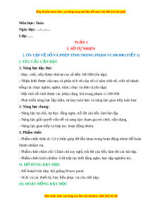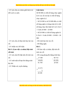 ụ nghìn, nghìn, trăm, ch c ụ và đ n v ơ ( ị ôn t p) ậ . - Đ t ặ tính r i ồ tính đư c ợ các phép c ng, ộ tr t ừ rong ph m ạ vi 100 000. - Phát tri n năng ể l c l ự p l ậ u n, ậ t duy t ư oán h c và năng ọ l c gi ự ao ti p t ế oán h c ọ 2. Năng l c chung ự : - Năng l c t ự ch ự , ủ t h ự c: ọ l ng ắ nghe, tr l ả i ờ câu h i ỏ , làm bài t p. ậ - Năng l c gi ự i ả quy t ế v n đ ấ và s ề áng t o: ạ tham gia trò ch i ơ , v n d ậ ng. ụ - Năng l c gi ự ao ti p và ế h p t ợ ác: ho t ạ đ ng ộ nhóm. 3. Phẩm ch t ấ : - Ph m ẩ ch t ấ nhân ái: Có ý th c gi ứ úp đ l ỡ n nhau t ẫ rong ho t ạ đ ng nhóm ộ đ hoàn ể thành nhi m ệ v . ụ - Ph m ẩ ch t ấ chăm ch : ỉ Chăm ch s ỉ uy nghĩ, tr l ả i ờ câu h i ỏ ; làm t t ố các bài t p. ậ - Ph m ẩ ch t ấ trách nhi m ệ : Gi t ữ r t ậ t , bi ự t ế l ng nghe, h ắ c ọ t p nghi ậ êm túc. II. Đ D Ồ ÙNG D Y Ạ H C Ọ - K ho ế ch ạ bài d y ạ , bài gi ng ả Power point. - SGK và các thi t ế b , h ị c ọ li u ph ệ c ụ v cho t ụ i t ế d y ạ . III. HOẠT Đ N Ộ G D Y Ạ H C Ọ