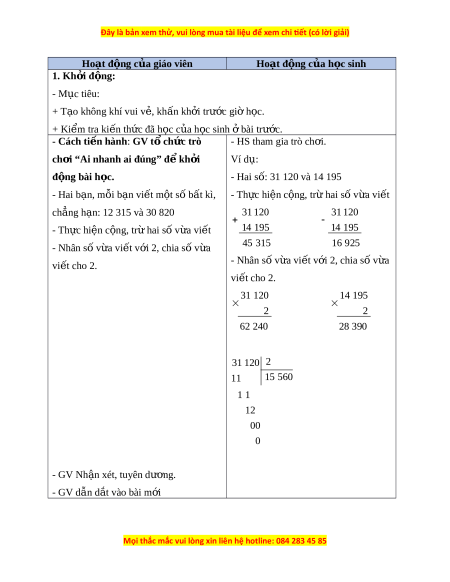 ơ “Ai nhanh ai đúng” đ kh ể i ở Ví d : ụ đ ng bài ộ h c. ọ - Hai số: 31 120 và 14 195 - Hai b n, m ạ ỗi b n vi ạ t ế m t ộ số bất kì, - Th c ự hiện c ng, ộ trừ hai số v a vi ừ t ế ch ng ẳ h n: ạ 12 315 và 30 820 31 120 31 120 - Th c hi ự n c ệ ng, t ộ r hai ừ số v a ừ vi t ế 14 195 14 195 - Nhân số v a ừ vi t ế v i ớ 2, chia s v ố a ừ 45 315 16 925 vi t ế cho 2. - Nhân số v a vi ừ t ế v i ớ 2, chia s v ố a ừ vi t ế cho 2. 31 120 14 195 2 2 62 240 28 390 31 120 2 11 15 560 1 1 12 00 0 - GV Nh n xét ậ , tuyên dư ng. ơ - GV d n d ẫ t ắ vào bài m i ớ