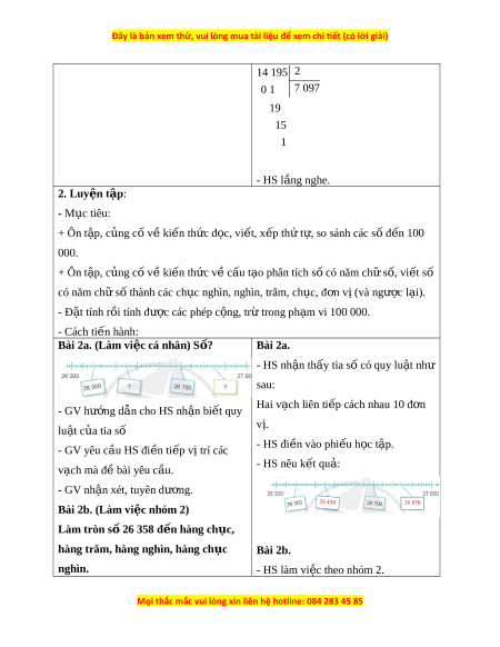 14 195 2 0 1 7 097 19 15 1 - HS l ng ắ nghe. 2. Luy n t ệ p ậ : - M c ụ tiêu: + Ôn t p, ậ c ng c ủ v ố ki ề n t ế h c đ ứ c, ọ vi t ế , x p t ế h t ứ , s ự o sánh các s đ ố n 100 ế 000. + Ôn t p, ậ c ng c ủ v ố ki ề n t ế h c v ứ ề c u t ấ o ạ phân tích s có năm ố ch s ữ , vi ố t ế số có năm ch s ữ ố thành các ch c nghì ụ n, nghìn, trăm, ch c, đ ụ n v ơ ( ị và ngư c l ợ i ạ ). - Đ t ặ tính r i ồ tính đư c ợ các phép c ng, ộ tr t ừ rong ph m ạ vi 100 000. - Cách ti n ế hành: Bài 2a. (Làm vi c cá ệ nhân) S ? ố Bài 2a. - HS nh n ậ th y t ấ ia số có quy lu t ậ như sau: Hai v ch ạ liên ti p ế cách nhau 10 đ n ơ - GV hư ng ớ d n cho H ẫ S nh n bi ậ t ế quy vị. lu t ậ c a t ủ ia số - HS đi n vào ề phi u ế h c t ọ p. ậ - GV yêu cầu HS đi n ề ti p ế v t ị rí các - HS nêu k t ế qu : ả v ch ạ mà đ bài ề yêu c u. ầ - GV nh n ậ xét, tuyên dư ng. ơ