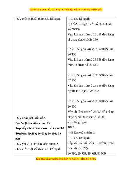 - GV m i ờ m t ộ số nhóm nêu k t ế qu . ả - HS nêu k t ế qu : ả b) Số 26 358 gần v i ớ số 26 360 h n ơ số 26 350 V y khi ậ làm tròn s 26 358 đ ố n hàng ế ch c, t ụ a đư c ợ số 26 360. Số 26 358 gần v i ớ số 26 400 h n ơ số 26 300 V y khi ậ làm tròn s 26 358 đ ố n hàng ế trăm, ta được s 26 400. ố Số 26 358 gần v i ớ số 26 000 h n ơ số 27 000 V y khi ậ làm tròn s 26 358 đ ố n hàng ế nghìn, ta đư c s ợ ố 26 000. Số 26 358 gần v i ớ số 30 000 h n ơ số 20 000 Vâ khi ỵ làm tròn s 26 358 đ ố n hàng ế - GV nh n xét ậ , k t ế lu n. ậ ch c nghì ụ n, ta đư c ợ số 30 000. Bài 2c. (Làm vi c ệ nhóm 2) - HS l ng ắ nghe. Sắp x p các s ế ố sau theo th t ứ t ự bé ừ Bài 2c. đ n l ế n: