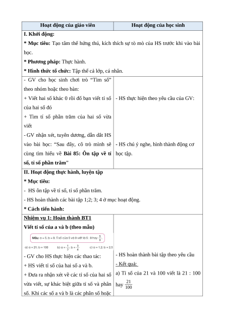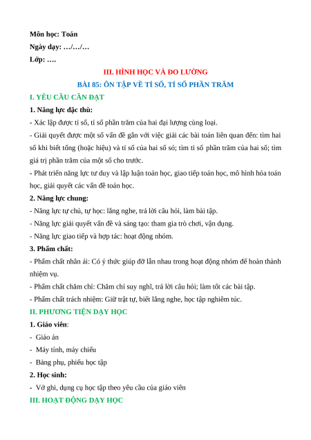 BÀI 85: ÔN TẬP VỀ TỈ SỐ, TỈ SỐ PHẦN TRĂM