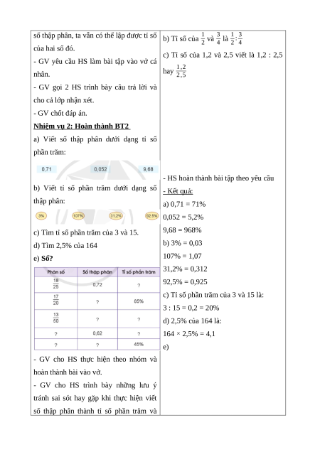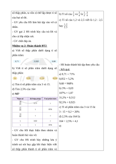 b) Viết tỉ số phần trăm dưới dạng số - Kết quả: thập phân: a) 0,71 = 71% 0,052 = 5,2%