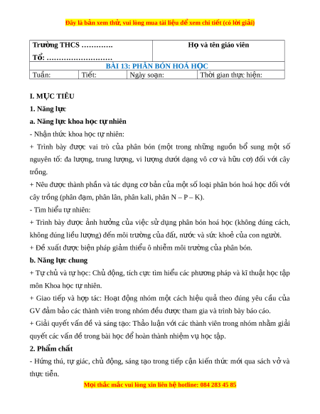 BÀI 13: PHÂN BÓN HOÁ H C Ọ Tuần: Ti t ế : Ngày so n: ạ Th i ờ gian th c ự hi n ệ : I. M C Ụ TIÊU 1. Năng l c ự a. Năng l c khoa h ự c t ọ nhi ự ên - Nh n t ậ h c ứ khoa h c t ọ nhi ự ên: + Trình bày đư c ợ vai trò c a ủ phân bón (m t ộ trong nh ng ữ ngu n ồ bổ sung m t ộ số nguyên t : ố đa lư ng, ợ trung lư ng, ợ vi lư ng ợ dư i ớ d ng ạ vô cơ và h u ữ c ) ơ đ i ố v i ớ cây trồng. + Nêu đư c ợ thành ph n ầ và tác d ng ụ c ơ b n ả c a ủ m t ộ s l ố o i ạ phân bón hoá h c ọ đ i ố v i ớ cây trồng (phân đ m