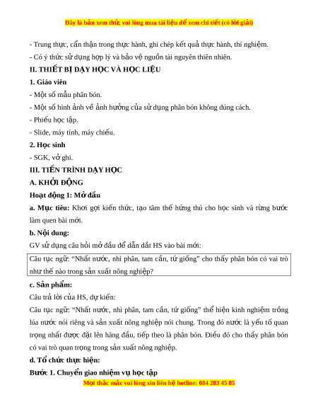 III. TIẾN TRÌNH DẠY H C Ọ A. KH I Ở Đ N Ộ G Hoạt đ ng 1 ộ : Mở đ u ầ a. M c ụ tiêu: Kh i ơ g i ợ ki n ế th c, ứ t o ạ tâm thế h ng ứ thú cho h c ọ sinh và t ng ừ bư c ớ làm quen bài m i ớ . b. N i ộ dung: GV sử d ng câu h ụ i ỏ m đ ở ầu đ d ể ẫn d t ắ HS vào bài m i ớ : Câu t c ụ ng : ữ “Nh t ấ nư c, ớ nhì phân, tam c n, ầ tứ gi ng” ố cho th y ấ phân bón có vai trò nh t ư hế nào trong s n ả xu t ấ nông nghi p? ệ c. Sản phẩm: Câu trả l i ờ c a H ủ S, dự ki n: ế Câu t c ụ ng : ữ “Nh t ấ nư c, ớ nhì phân, tam c n, ầ tứ gi ng” ố thể hi n ệ kinh nghi m ệ tr ng ồ lúa nư c ớ nói riêng và s n ả xu t ấ nông nghi p