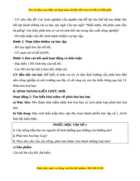 a) Mục tiêu: Nêu đư c ợ khái ni m ệ phân bón hoá h c ọ và cách phân lo i ạ phân bón hoá h c. ọ b) N i ộ dung: H c ọ sinh th o ả lu n ậ theo c p ặ đôi, hoàn thành phi u ế h c ọ t p ậ số 1, t ừ đó lĩnh h i ộ ki n t ế h c. ứ PHI U Ế H C Ọ TẬP S 1 Ố 1. Cây trồng h p t ấ h các nguyên ụ t di ố nh dư ng qua ỡ nh ng con đ ữ ư ng nào? ờ 2. Phân bón hoá h c ọ là gì? 3. Theo nhu c u c ầ a cây ủ tr ng, phân bón đ ồ ư c ợ chia thành nh ng l ữ o i ạ nào?