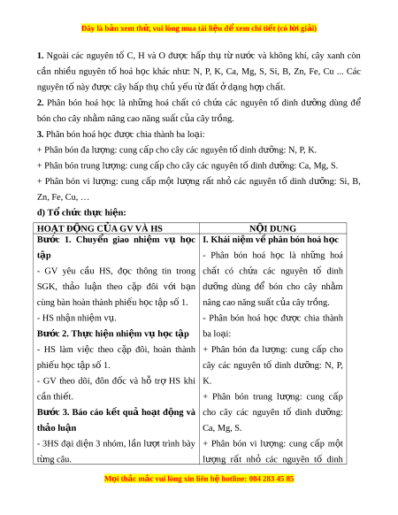 d) Tổ chức thực hi n ệ : HOẠT Đ N Ộ G C A Ủ GV VÀ HS N I Ộ DUNG Bư c ớ 1. Chuy n ể giao nhi m ệ vụ h c ọ I. Khái ni m ệ v phâ ề n bón hoá h c ọ t p ậ - Phân bón hoá h c ọ là nh ng ữ hoá - GV yêu c u ầ HS, đ c
