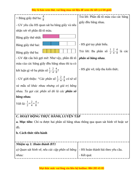 - Bước đầu nhận biết sự bằng nhau của hai phân số (thông qua hình ảnh trực quan).