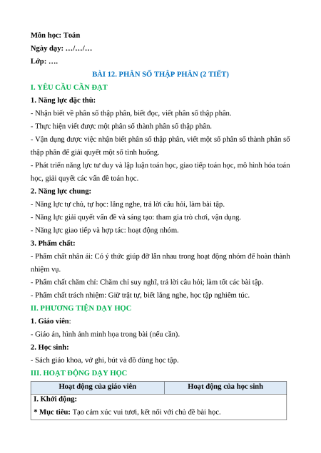 BÀI 12. PHÂN SỐ THẬP PHÂN (2 TIẾT)