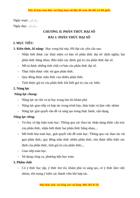 BÀI 1: PHÂN THỨC ĐẠI SỐ I. MỤC TIÊU: