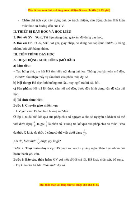 Giáo án Phân thức đại số Toán 8 Cánh diều