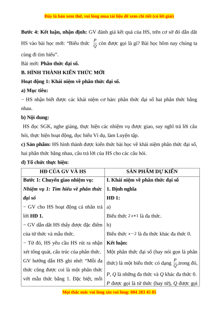 − HS nhận biết được các khái niệm cơ bản: phân thức đại số hai phân thức bằng nhau. b) Nội dung: