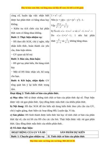 a) Mục tiêu: Mô tả được những tính chất cơ bản của phân thức đại số. Thực hiện