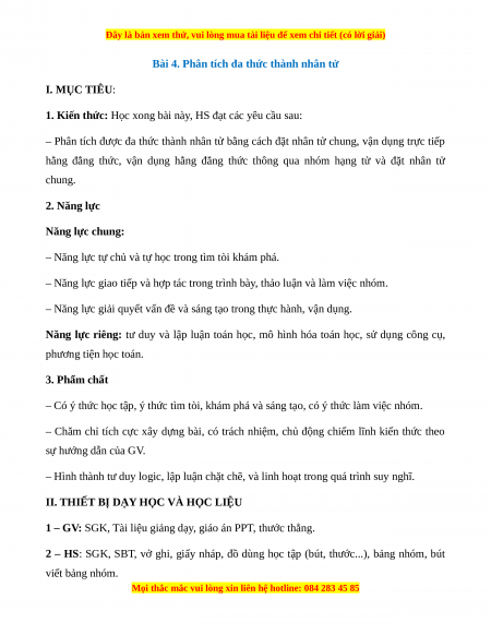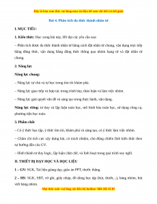 Bài 4. Phân tích đa thức thành nhân tử I. MỤC TIÊU: