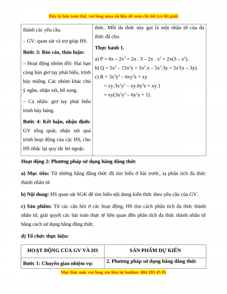 c) Sản phẩm: Từ các câu hỏi ở các hoạt động, HS tìm cách phân tích đa thức thành
