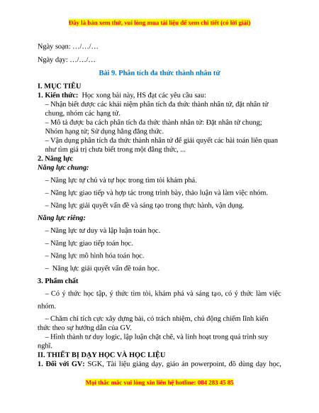 Bài 9. Phân tích đa thức thành nhân tử I. MỤC TIÊU