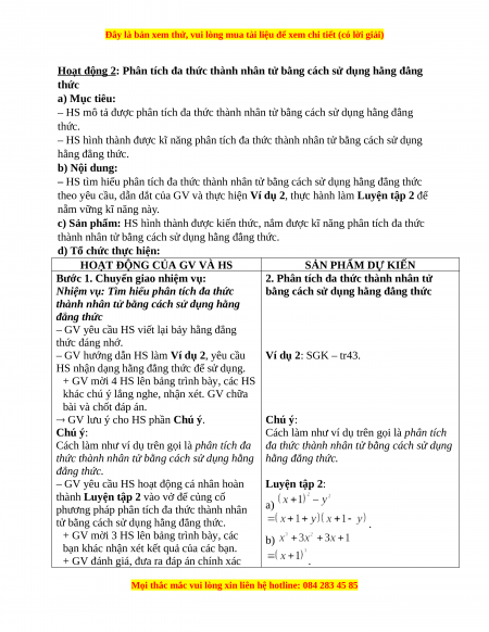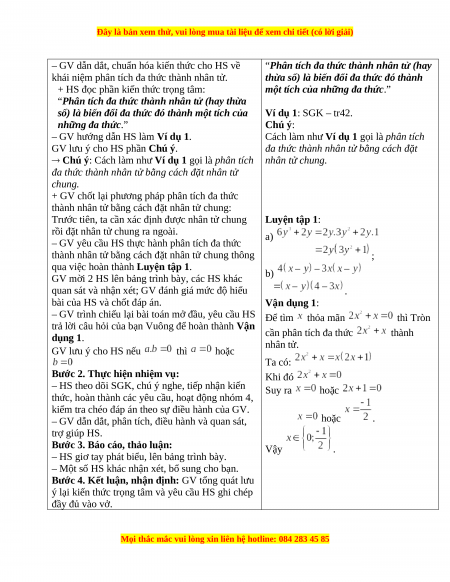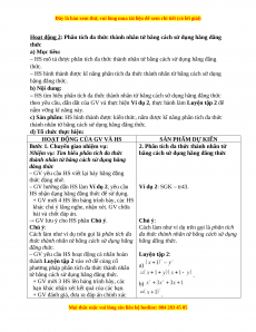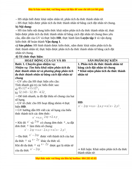 ‒ HS thực hiện được phân tích đa thức thành nhân tử bằng cách đặt nhân tử chung. b) Nội dung: